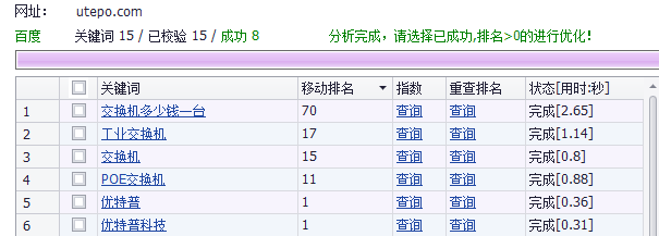 Pc端的关键词都已经达标,移动端的关键只达标了“安防专用交换机”一个词,“交换机”排名15,“poe交换机”排名11,“工业交换机”排名17。